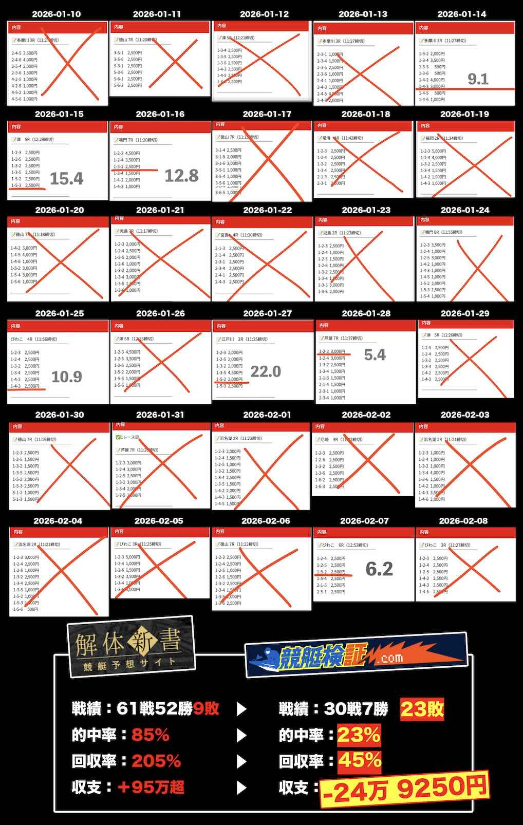以下は、そうした調整された実績と、当サイト「競艇検証.com」でのリアルな検証結果の比較です。