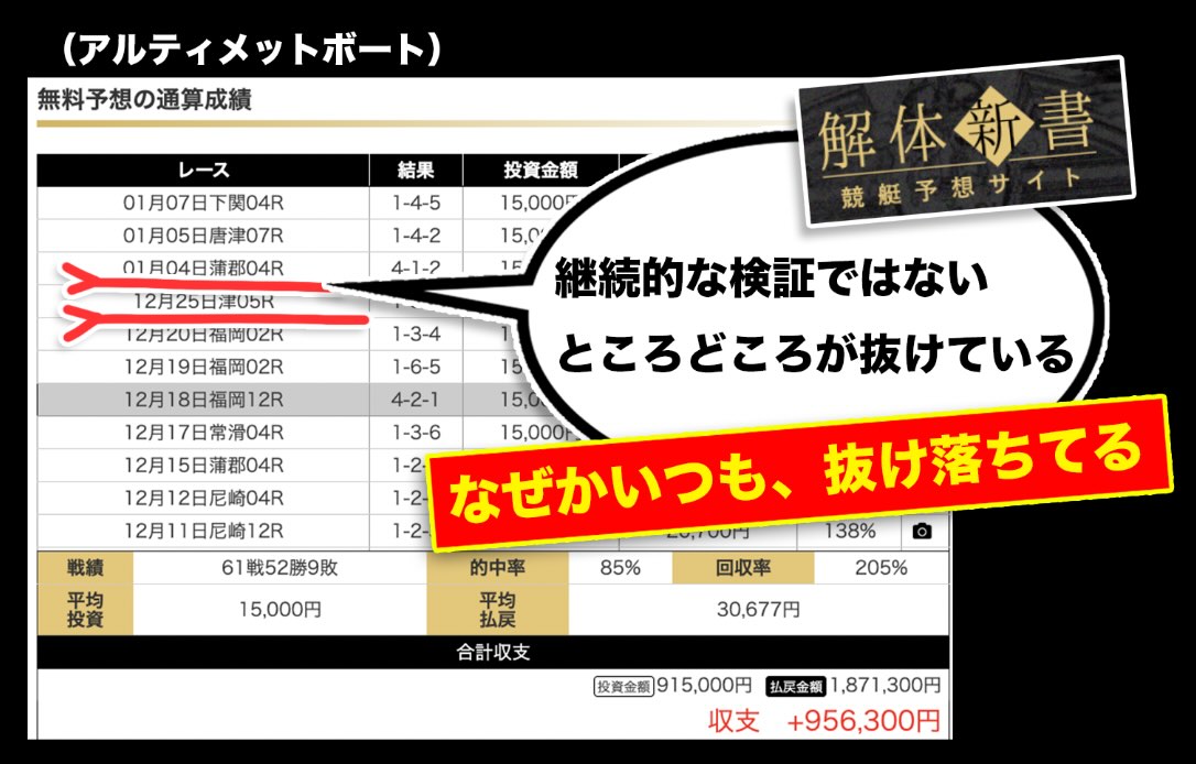 ATARCA(アタルカ)という競艇予想サイトは、外部集客サイトではプラス収支が続くように見えるが、実際には誇張表現に近く、無料予想の掲載履歴では、不的中レースが一部省略されているケースも見受けられた。実際に競艇検証.comが1ヶ月かけてATARCA(アタルカ)の無料予想精度を30日間、継続的に検証を行ったところ、