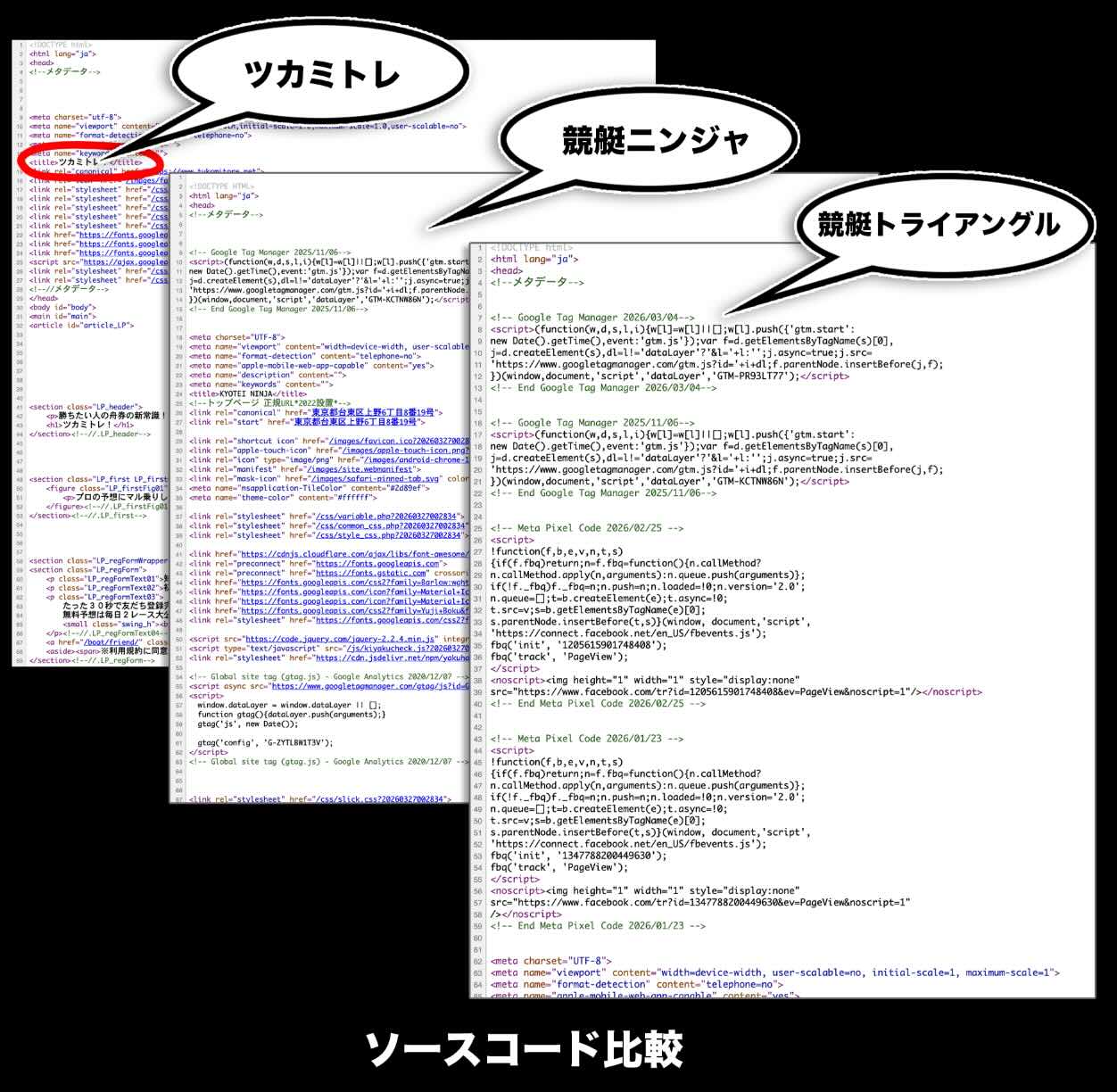 さらにソースコードの比較では、「競艇ニンジャ」「競艇トライアングル」と構造レベルでの一致が確認されており、ツカミトレについても無関係と見る方が難しい内容であった。 -