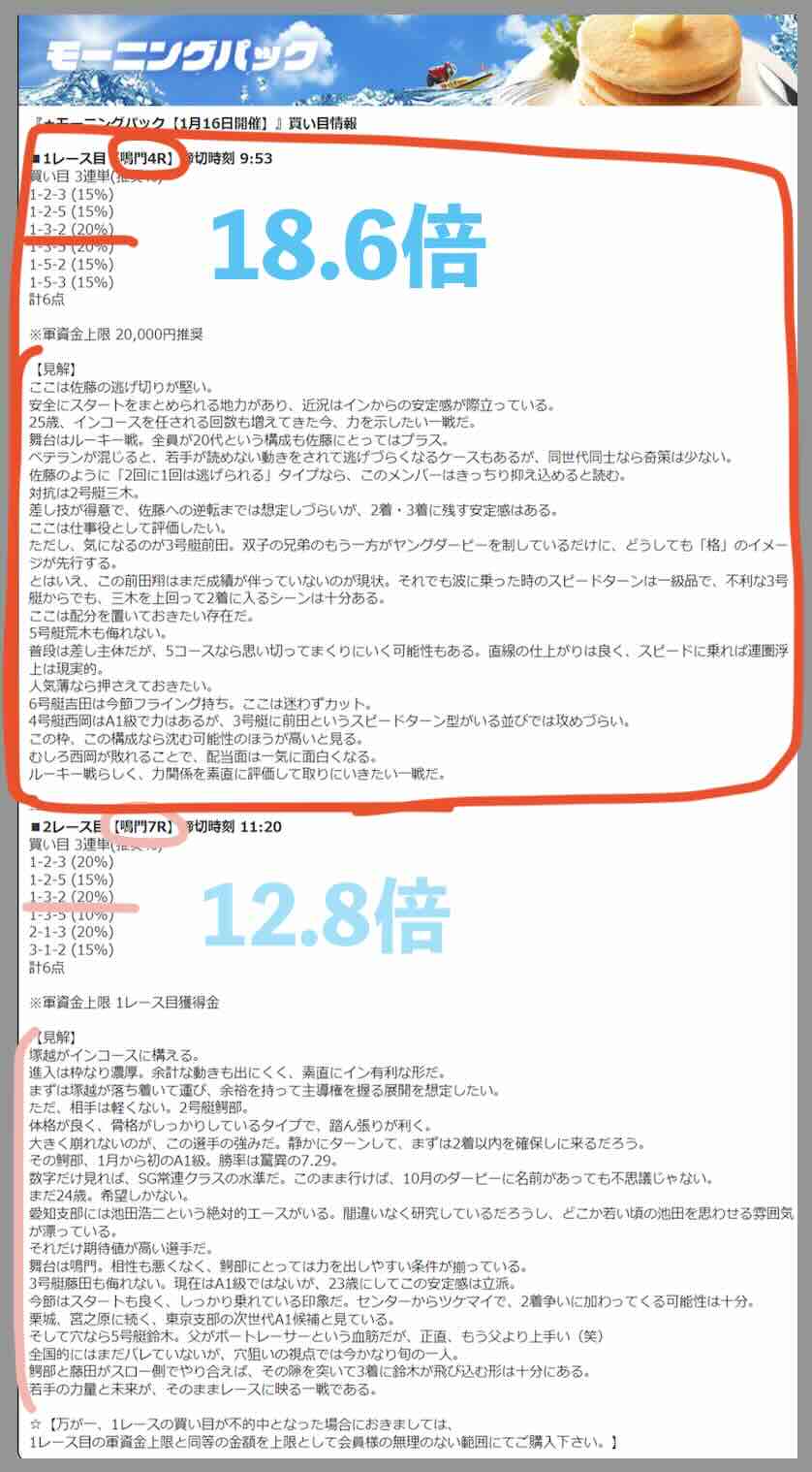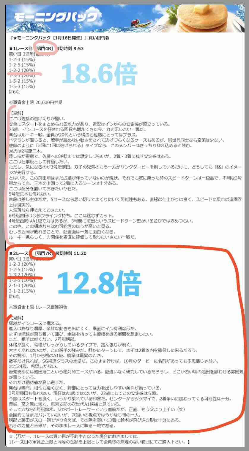 1/16には、またしても「モーニングパック」というプランで鳴門4R(18.6倍)→鳴門7R(12.8倍)を的中させ、18万 9440円の払戻しとなった(今回も見解が超スゴい!)。