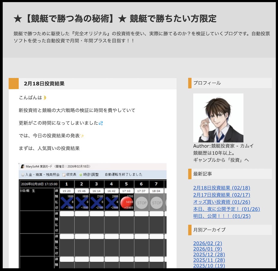 毎日の実践結果を公開しながら、競艇を投資として捉える新しい視点を提案しているブログです。