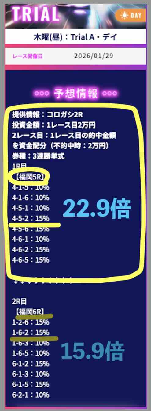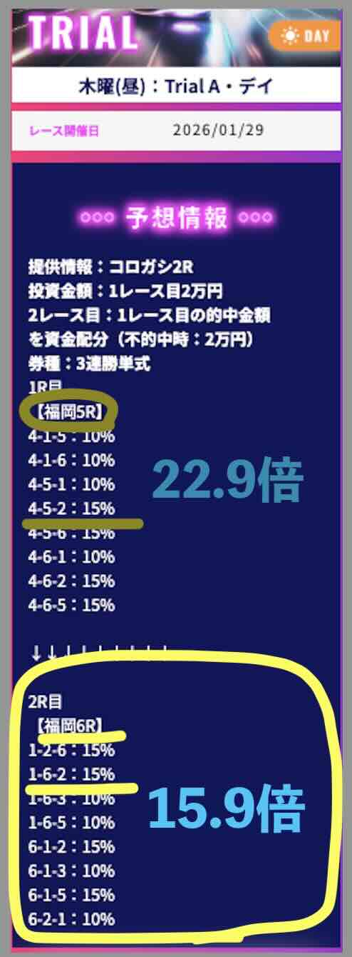 1/29には「TRIALデイ」という120ptの安価なコースで、福岡5R(22.9倍)→福岡6R(15.9倍)とコロガシが上手くいき、16万 3770円の払戻しとなった。