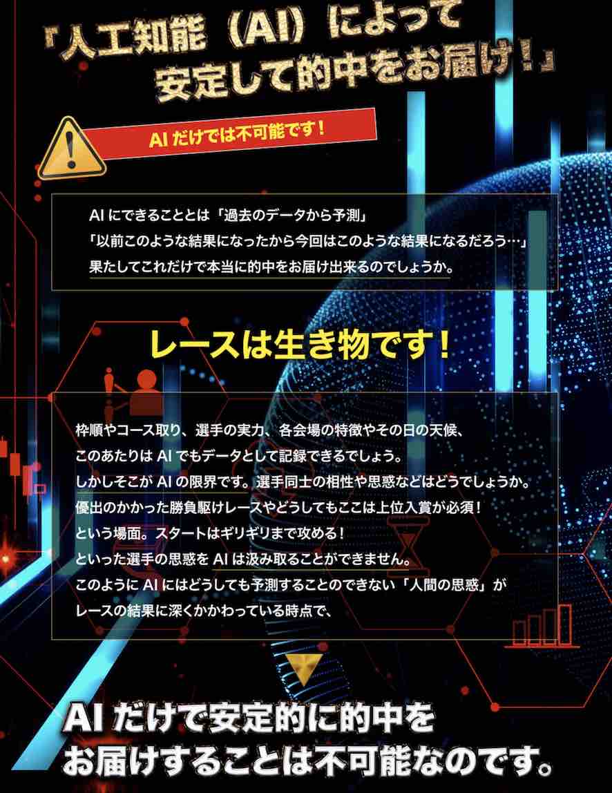 競艇チャンピオンという競艇予想サイトの非会員ページ全体を見ると、まるで優秀なAIがあり、それに加え40年キャリアのベテランが在籍しているように見せてるが、このクオリティの競艇チャンピオン(CHAMPION)がAIを開発したとは思えないし、そのような証拠(AIだけで完璧じゃないならAI部分の予想を無料予想(無料情報)として公開すればいい)を開示できないのは、実際には無いということじゃないだろうか?(それに後ほど書くが、この競艇チャンピオンを運営するグループサイトでこれまでに何度も「AI」という言葉が出てきたが、証拠を見たことが無い)