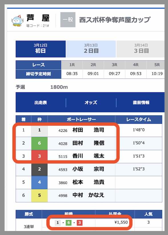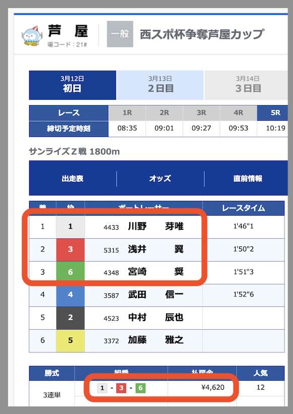 2本目の芦屋6Rのレース結果は15.5倍だったので、