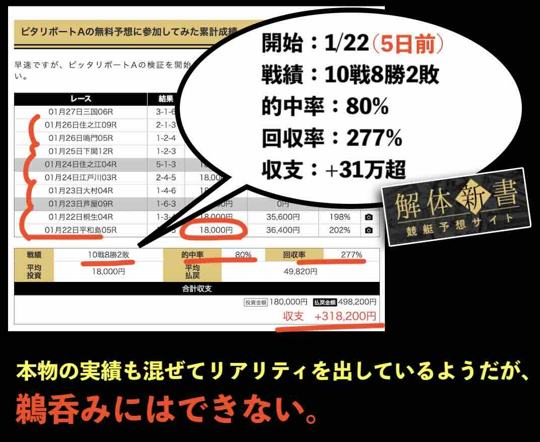 実際、「解体新書」というサイトで報告されていた戦績は「10戦8勝2敗」、すなわち的中率80%とされていたが、その信頼性については慎重に確認する必要がある。というのも、過去に検証した「ルーキーズ」の事例では、検証期間中に全12レースが提供されていたにもかかわらず、的中した2日分のみが紹介されていたことが確認されている。
