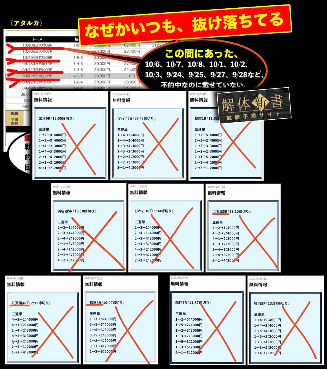 ところが、同サイトが公表している戦績と照らし合わせると、あまりに乖離しており、不的中レースが不自然に省かれている点が確認された。