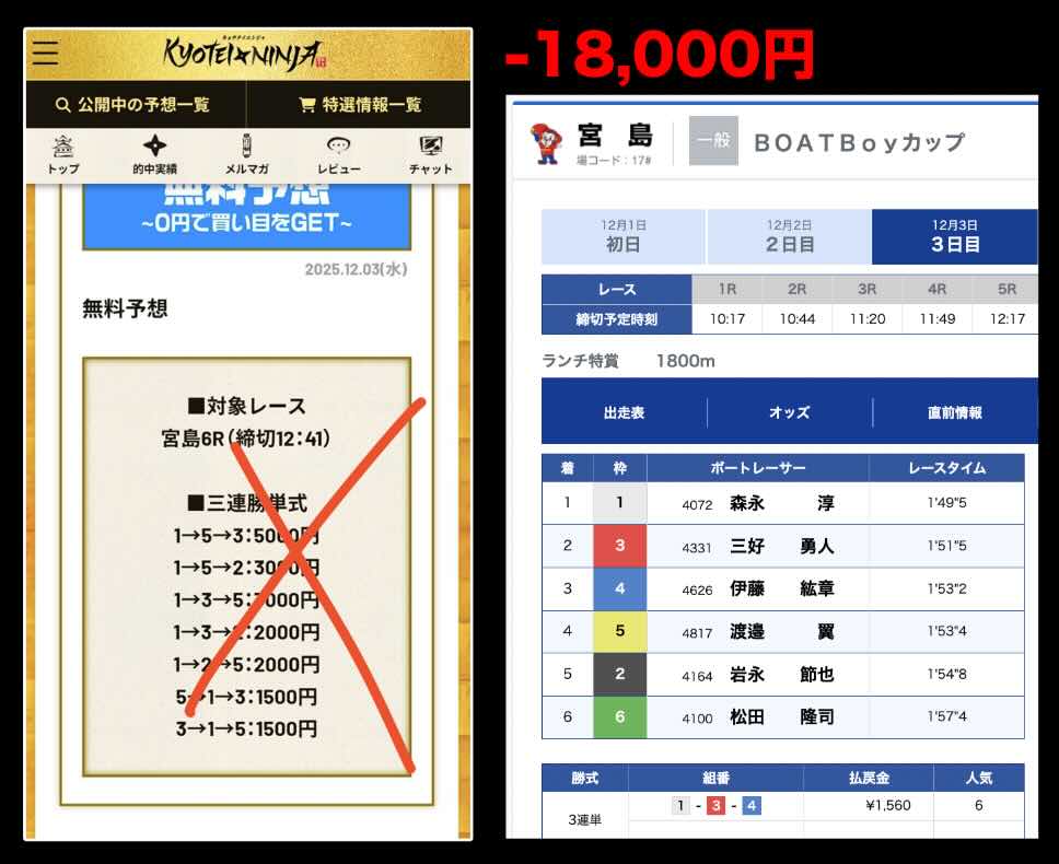 競艇NINJA(競艇ニンジャ)の無料予想抜き打ち検証 1回目(2025年12月3日・宮島6R)