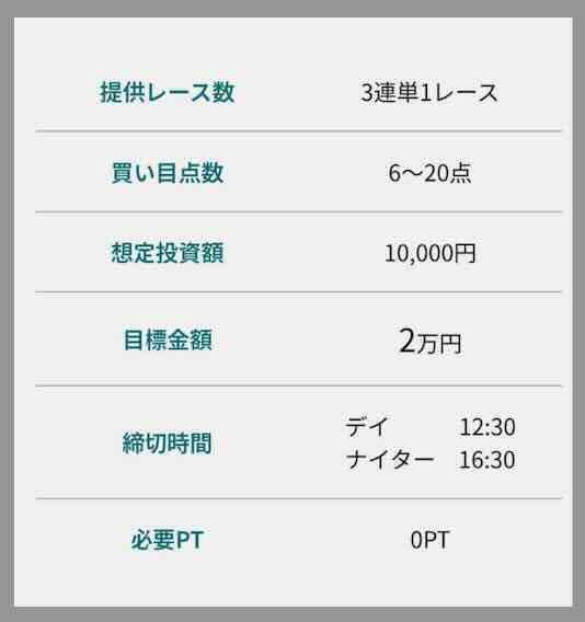 競艇タッグで提供される無料予想(無料情報)は、1日2レース(デイ・ナイター)の構成となっており、券種は基本的に3連単の単発提供である。