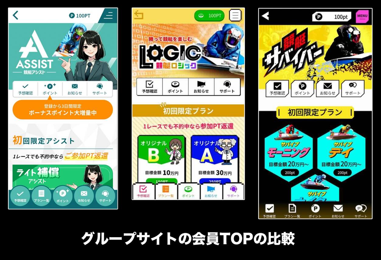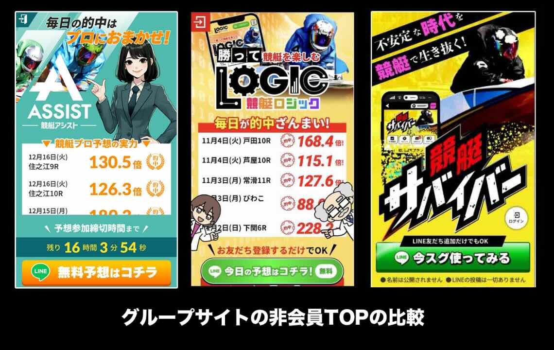 これまで調べてきた情報と、競艇アシストの会員登録後にも得た情報などを元に考えると、以下の競艇予想サイトが競艇アシストのグループサイトとして考えられる。