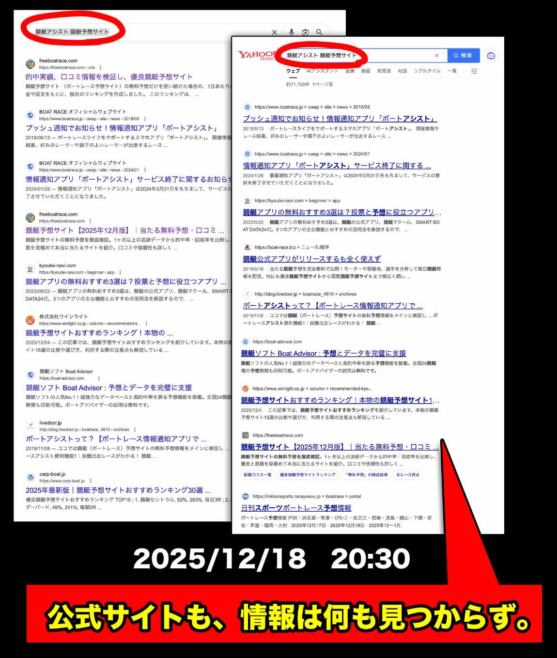 2025年12月18日の20時30分時点で、「競艇アシスト 競艇予想サイト」という複合キーワードで検索したところ、この時点では「競艇アシスト」に関する情報は検索結果上に一切表示されていなかった。