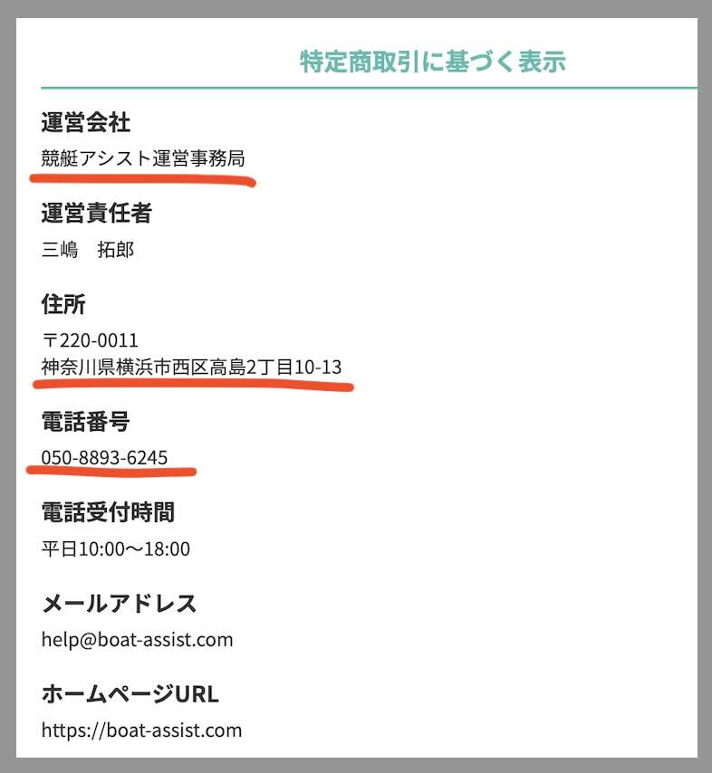 改めて「競艇アシスト」の特商法ページを確認すると、運営責任者として「三嶋拓郎」という「男性」の個人名が記載されている。