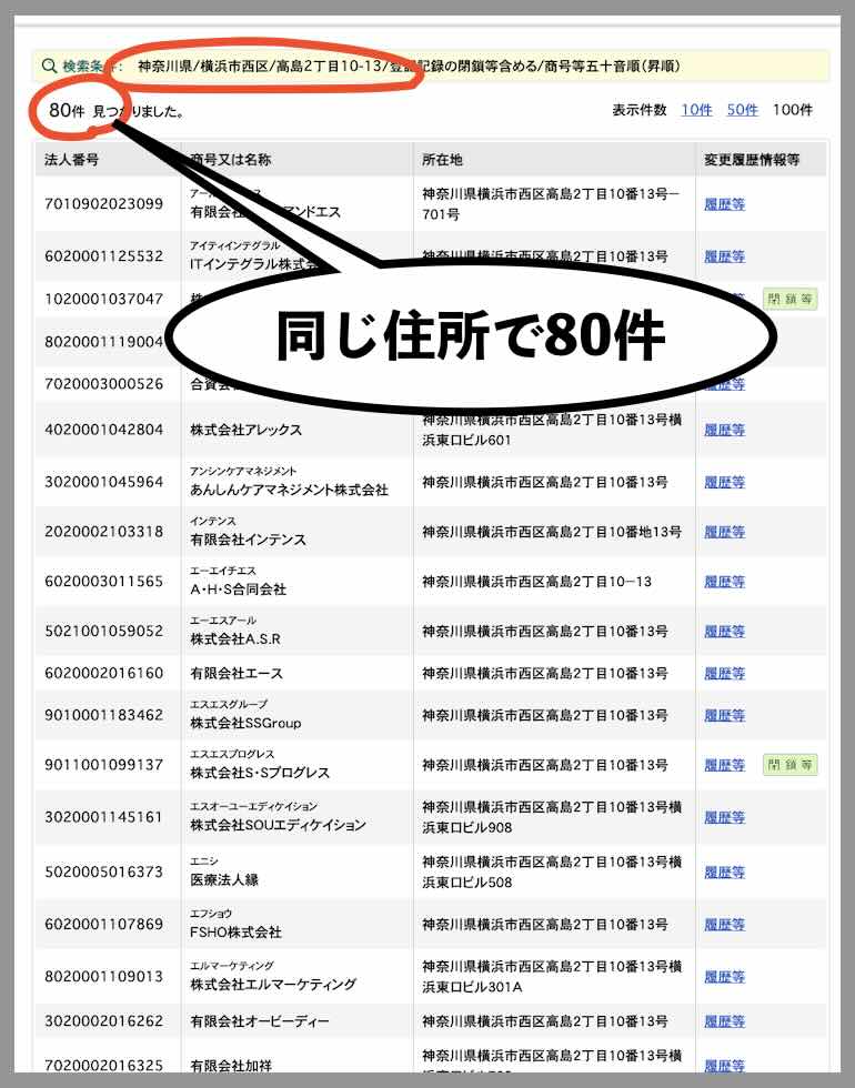 すると、「神奈川県横浜市西区高島2-10-13」という同一住所を使用している法人が、80件以上も登録されていることが判明した。