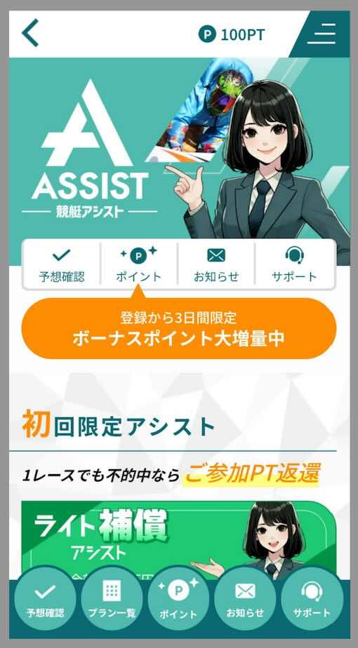 競艇予想サイトに会員登録をすると、初回会員登録をした利用者に対し、ポイント還元をする予想サイトもあるが、競艇アシストの場合は初回会員登録した人に対し、100ポイントのポイント還元を行っている。