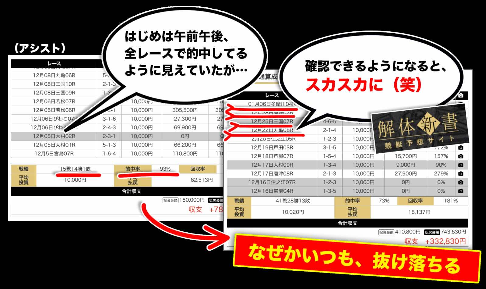 競艇アシストという競艇予想サイトの無料予想について、外部集客サイトが公開している戦績を精査したところ、数値の推移に不自然な傾向が確認できた。