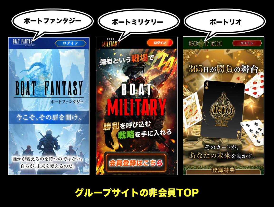 同グループの比較的新しいサイトとして挙げられる「ボートリオ」も同様の印象であり、「ボートヘブン」、「修羅」、「競艇メゾン」、「ユートピア」なども含め、デザインの方向性や質感は驚くほど似通っている。