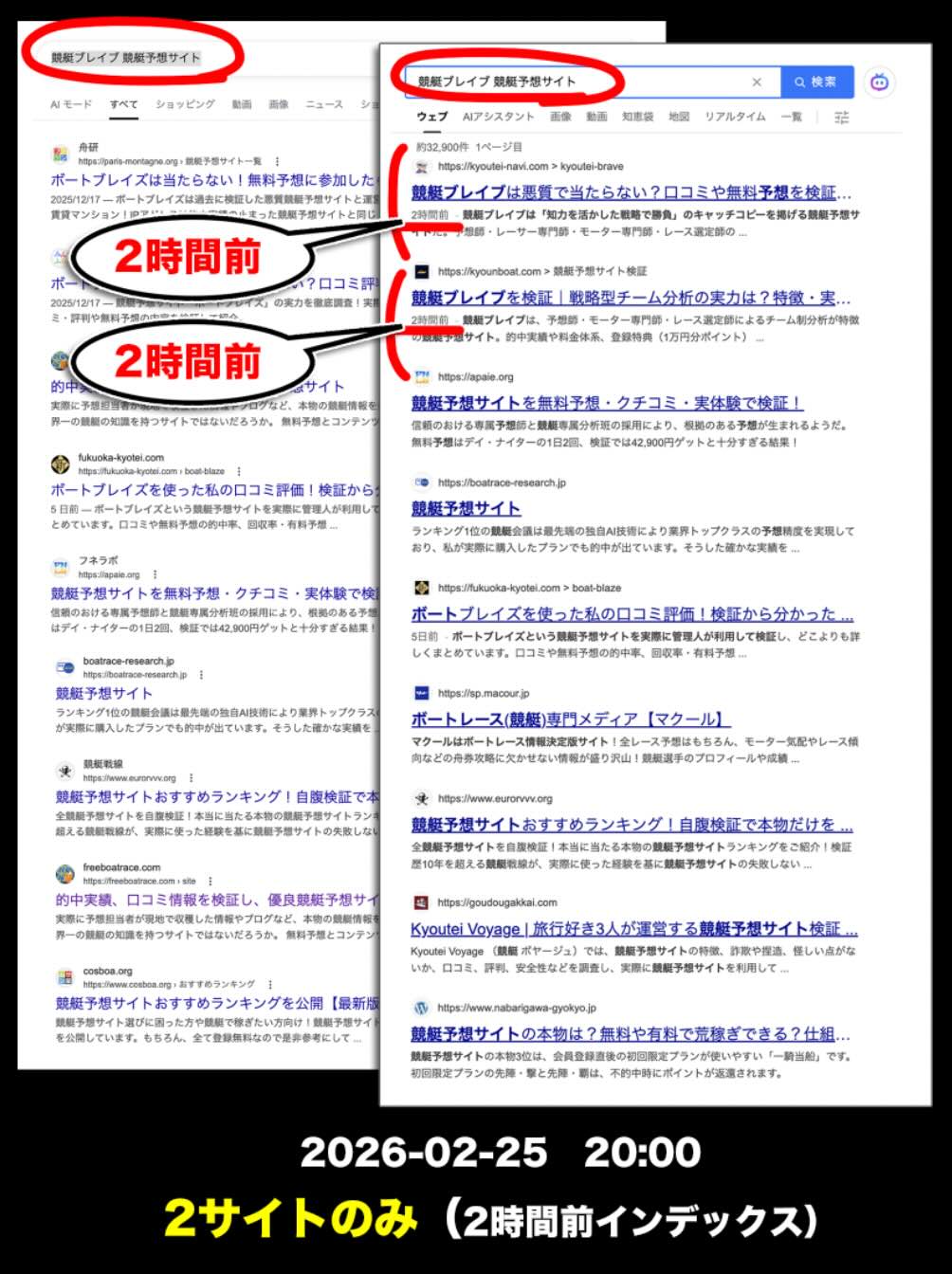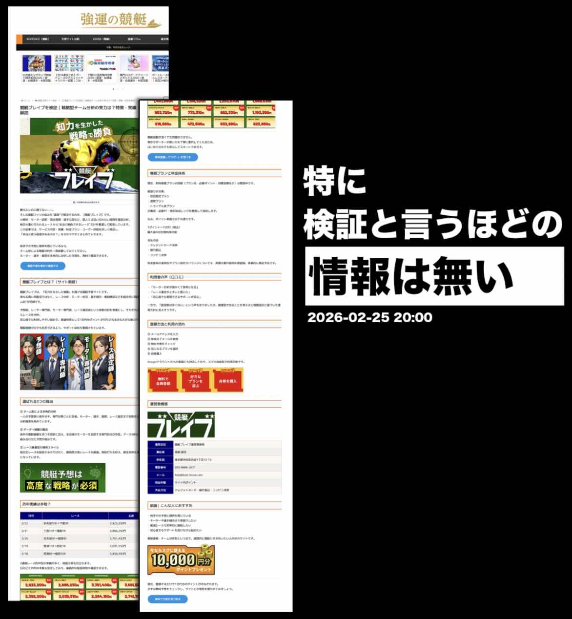 2026年2月25日20時時点で、「競艇ブレイブ 競艇予想サイト」という複合キーワードで検索したところ、確認できた情報はわずか2件のみであった。
