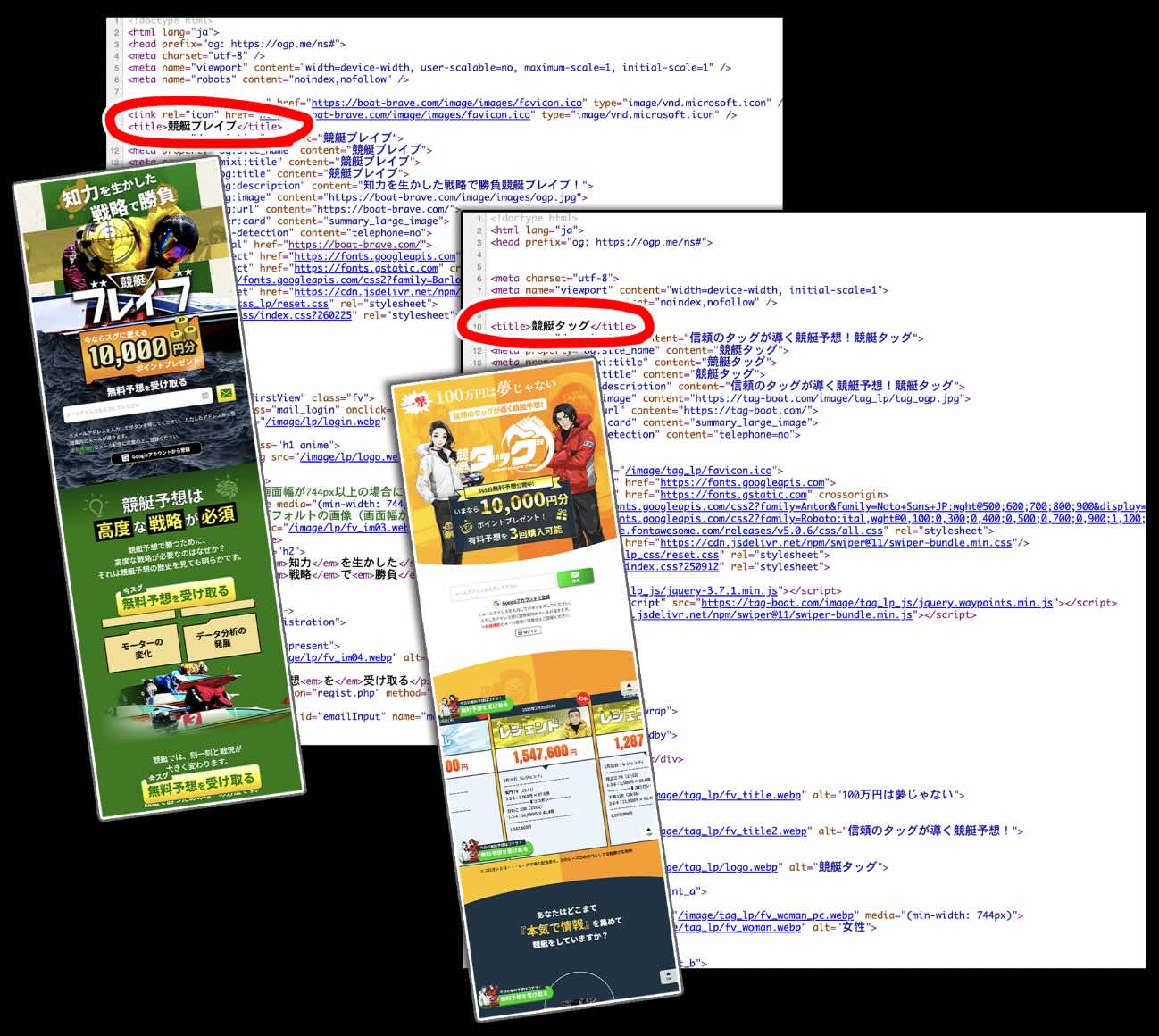 さらに「競艇タッグ」に至っては、非会員TOPページが同一のLPテンプレート構造で設計されている痕跡が明確であり、導線設計・部品名・レイアウト骨格まで共通している。