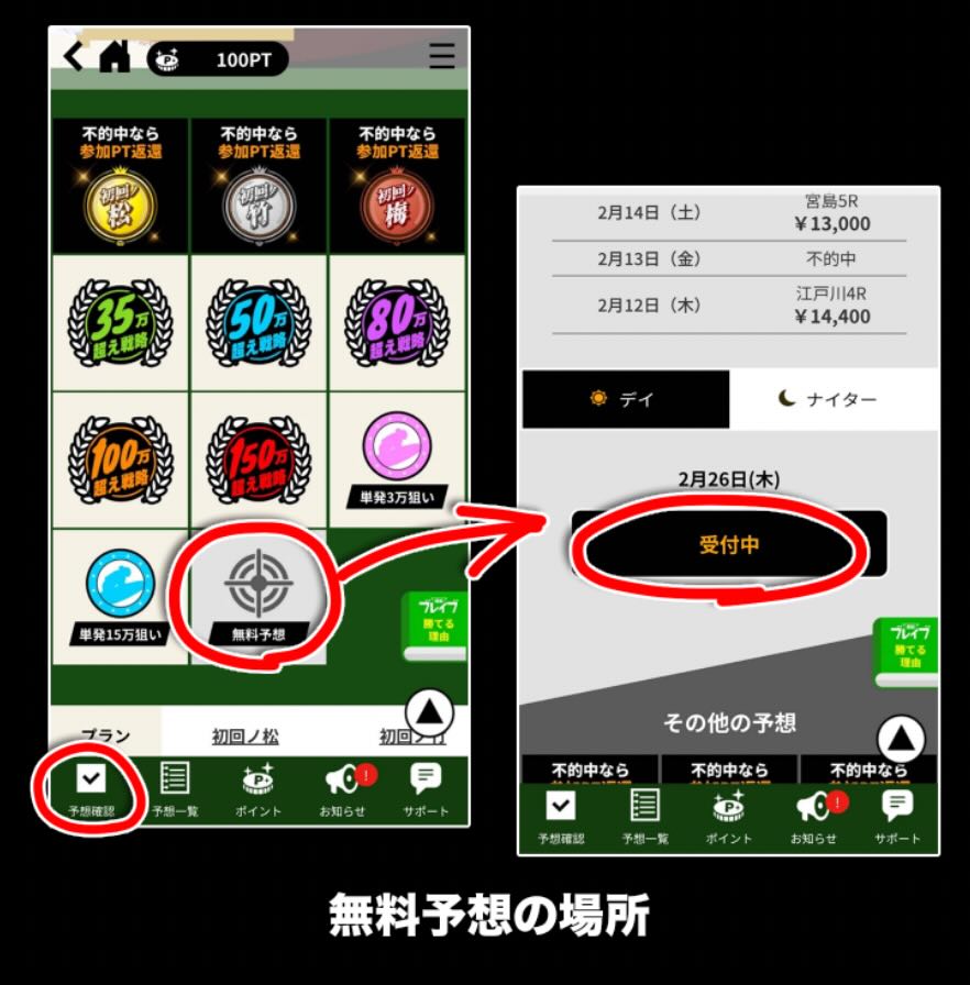 無料予想に参加して、買い目の公開時刻の前に「受付中」と書かれたボタンを押しておく。