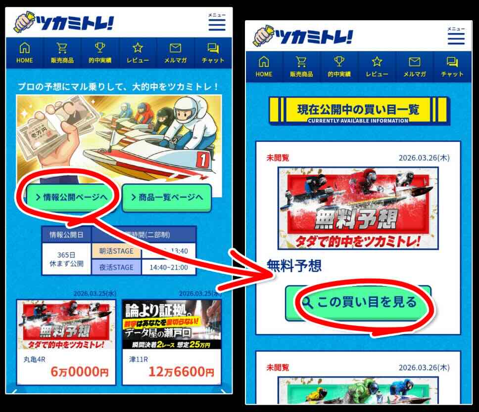 ツカミトレという競艇予想サイトで提供される無料予想(無料情報)は、有料コースとは異なり、会員ページ内から直接確認できる構成となっている。