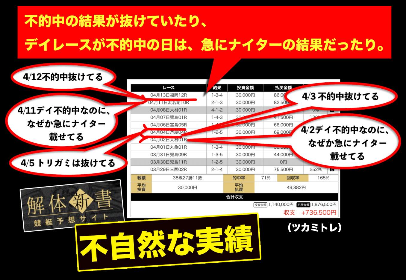 外部集客サイト「解体新書」によるツカミトレの無料予想の戦績は、一見すると高い的中率が続いているように見える。