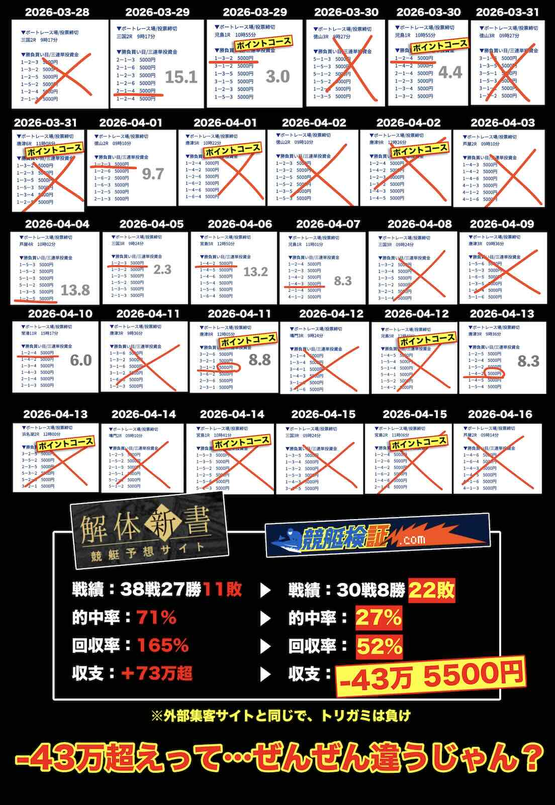実際に、後ほど紹介しているように、競艇検証.comが同一条件で忖度なく継続検証を行った結果は、30戦中8勝22敗、的中率27%、回収率52%、収支は−43万円超という内容であった(集客サイトの結果と乖離している)。