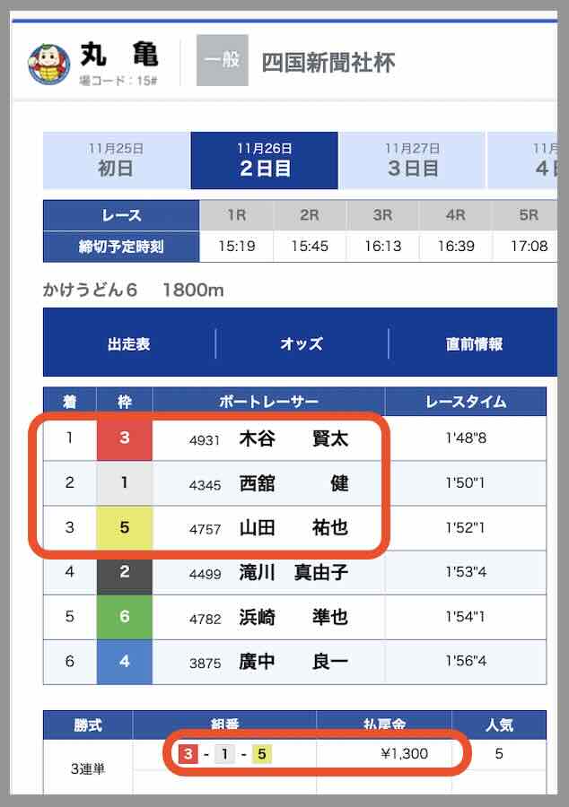 2レース目の丸亀6Rは13.0倍の的中だった。