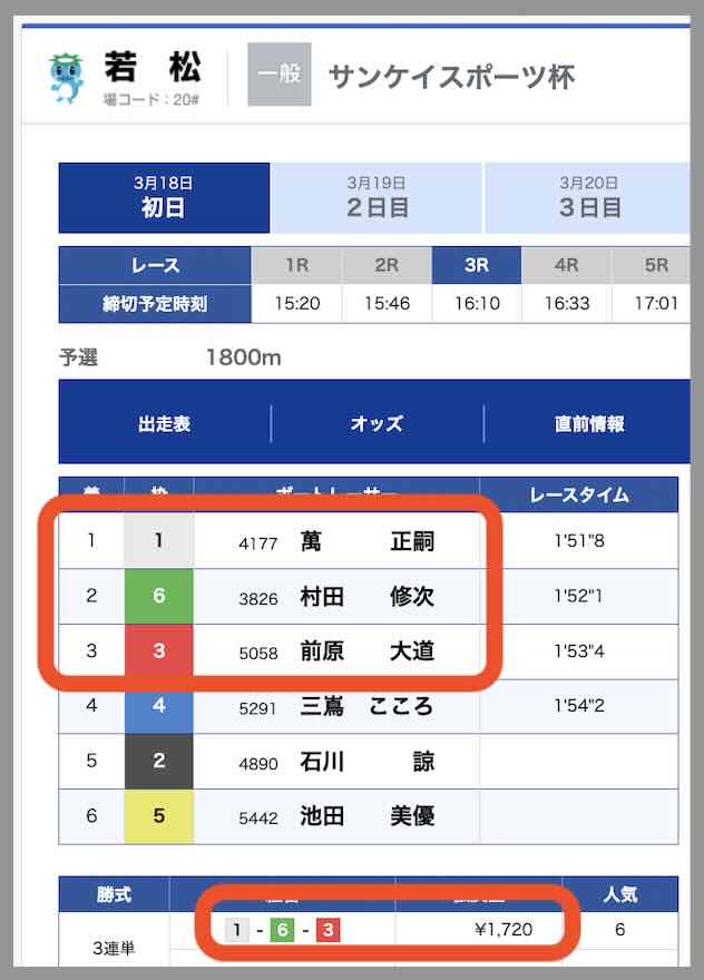 1レース目の若松3Rは、17.2倍の的中だった。