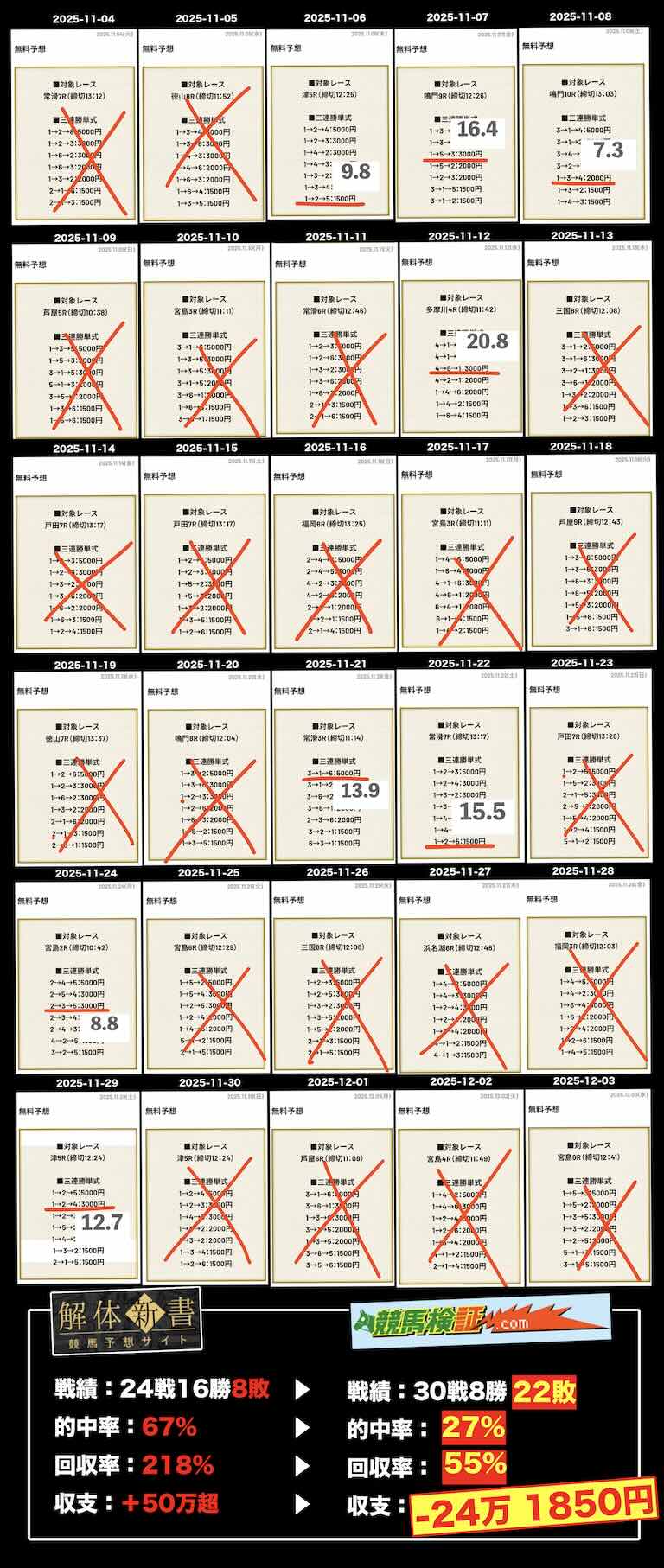 | 無料予想の検証期間 | 16レース(集客サイトと同じ) |