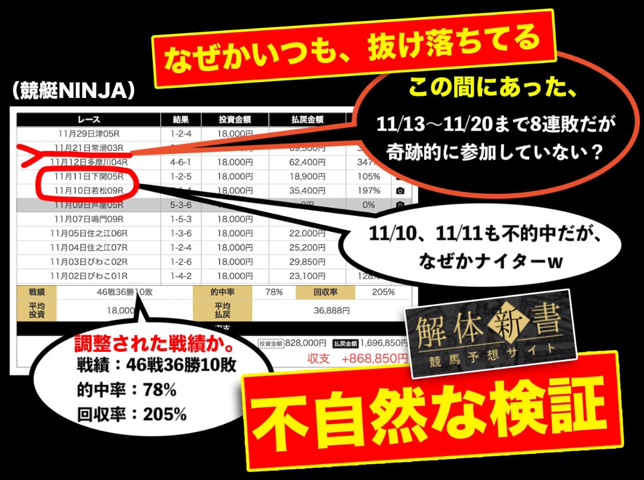 加えて、戦績データの一部には不的中レースが省略されていたと見られる記載もあり、事実を正確に反映しているのかを再検証するために実際に競艇検証.comが同条件で再検証を行ったところ、大きく乖離した。