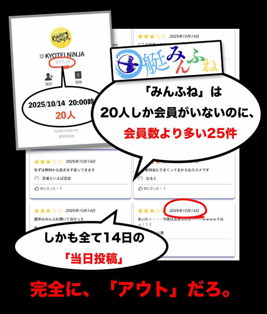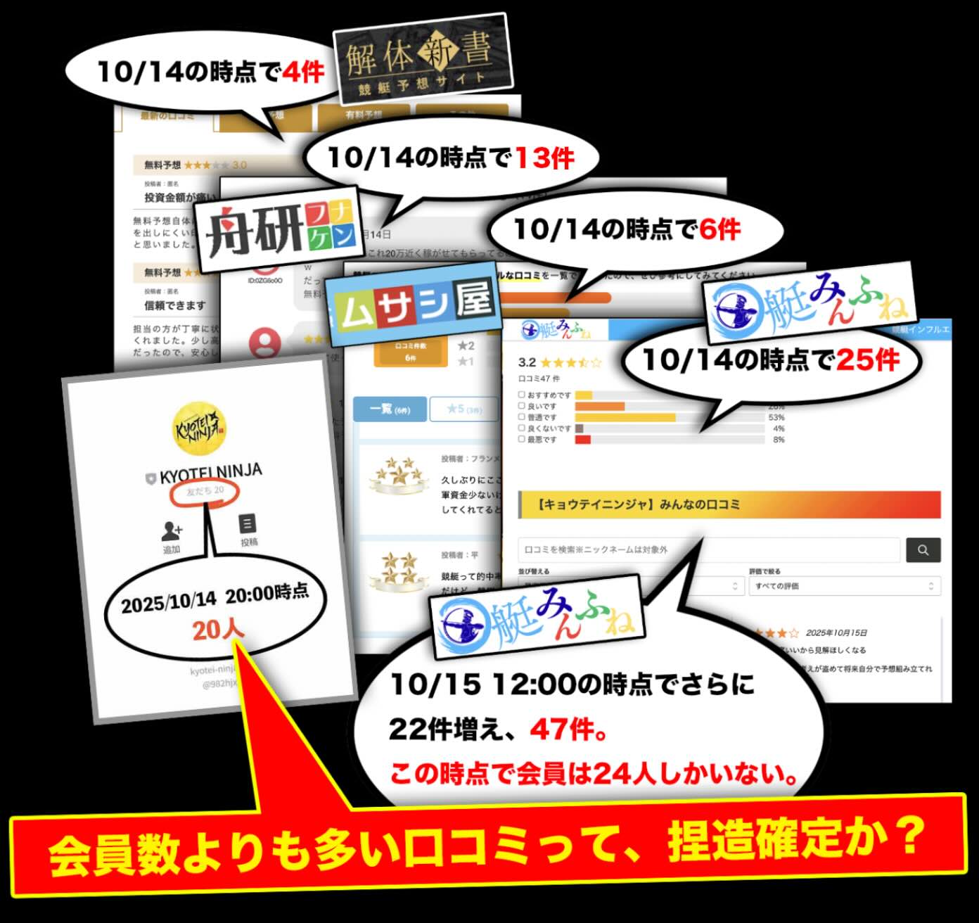 それにもかかわらず、「みんふね」や「フネラボ」「舟研」などの外部集客サイトが、開設初期の段階から競艇NINJAを“検証済み”として紹介しており、時系列的な整合性に矛盾が生じている。