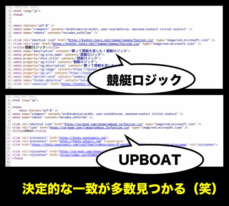加えて、ソースコードを比較すると、既存のフネラボ系グループサイトと類似する箇所が複数確認された。同じ箇所でミスがあり、フォルダ構成やCSS管理、メタ設定の手法まで全てが共通しており、偶然の一致とは言い難い。