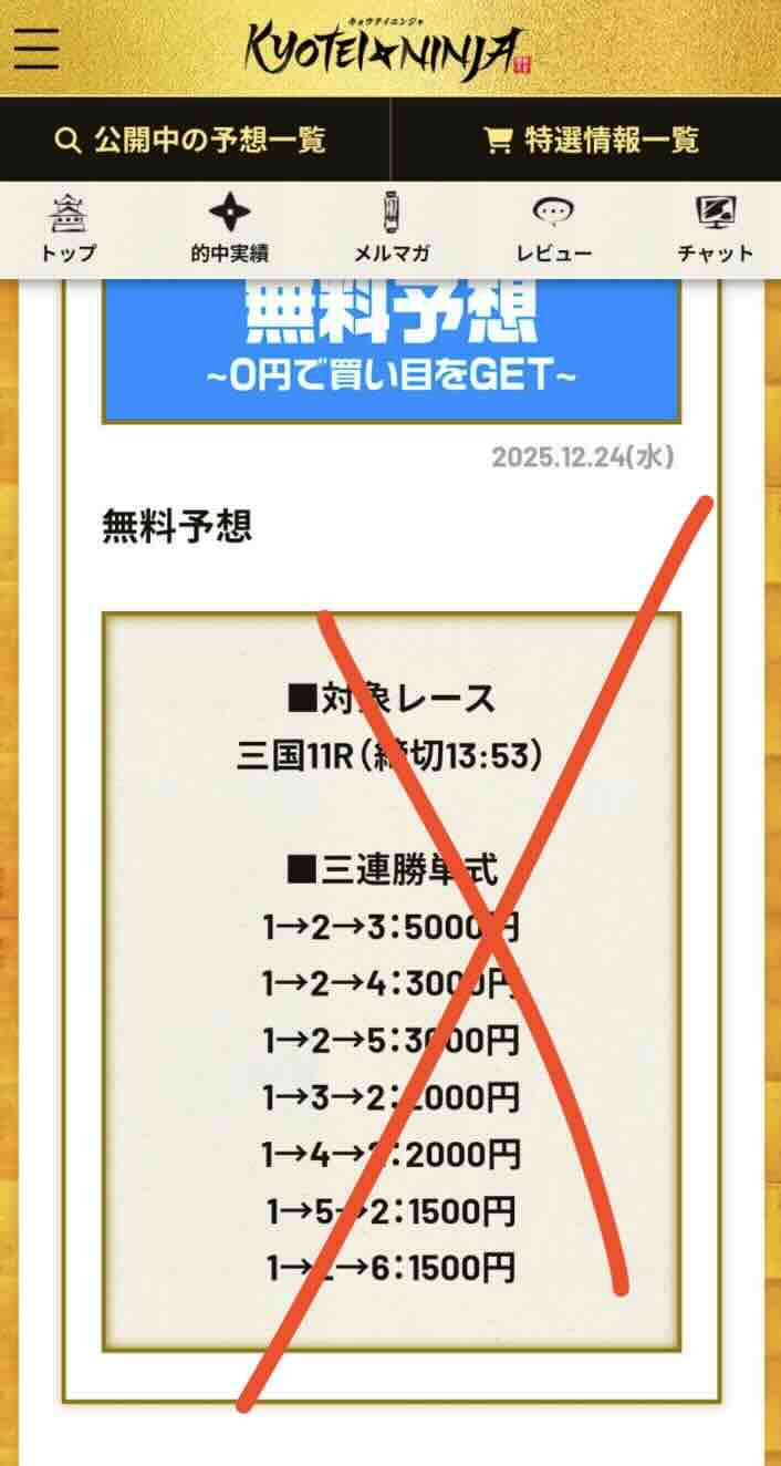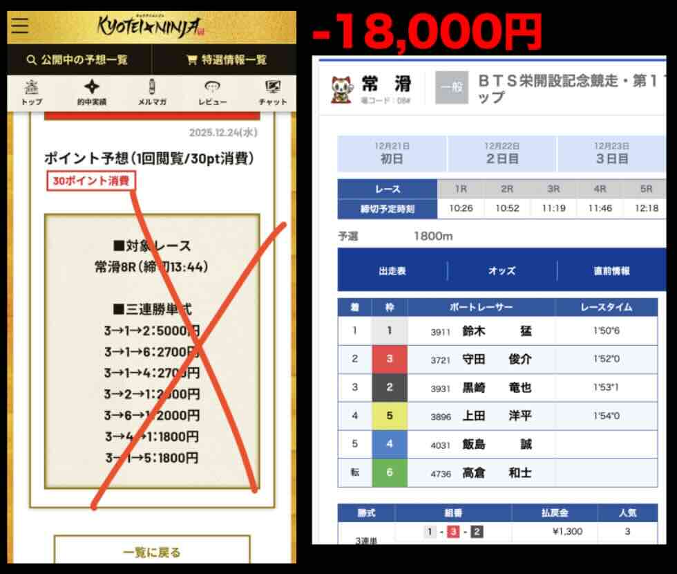 さて、今回抜き打ち検証した競艇NINJA(競艇ニンジャ)の無料予想(無料情報)だが、2025年12月24日の三国11Rは不的中という結果だったが、同日、30ポイントで提供されたポイントコースについても不的中となっており、 今回は同日、12月24日「常滑8R」で提供された買い目を対象に検証を行うことにした。