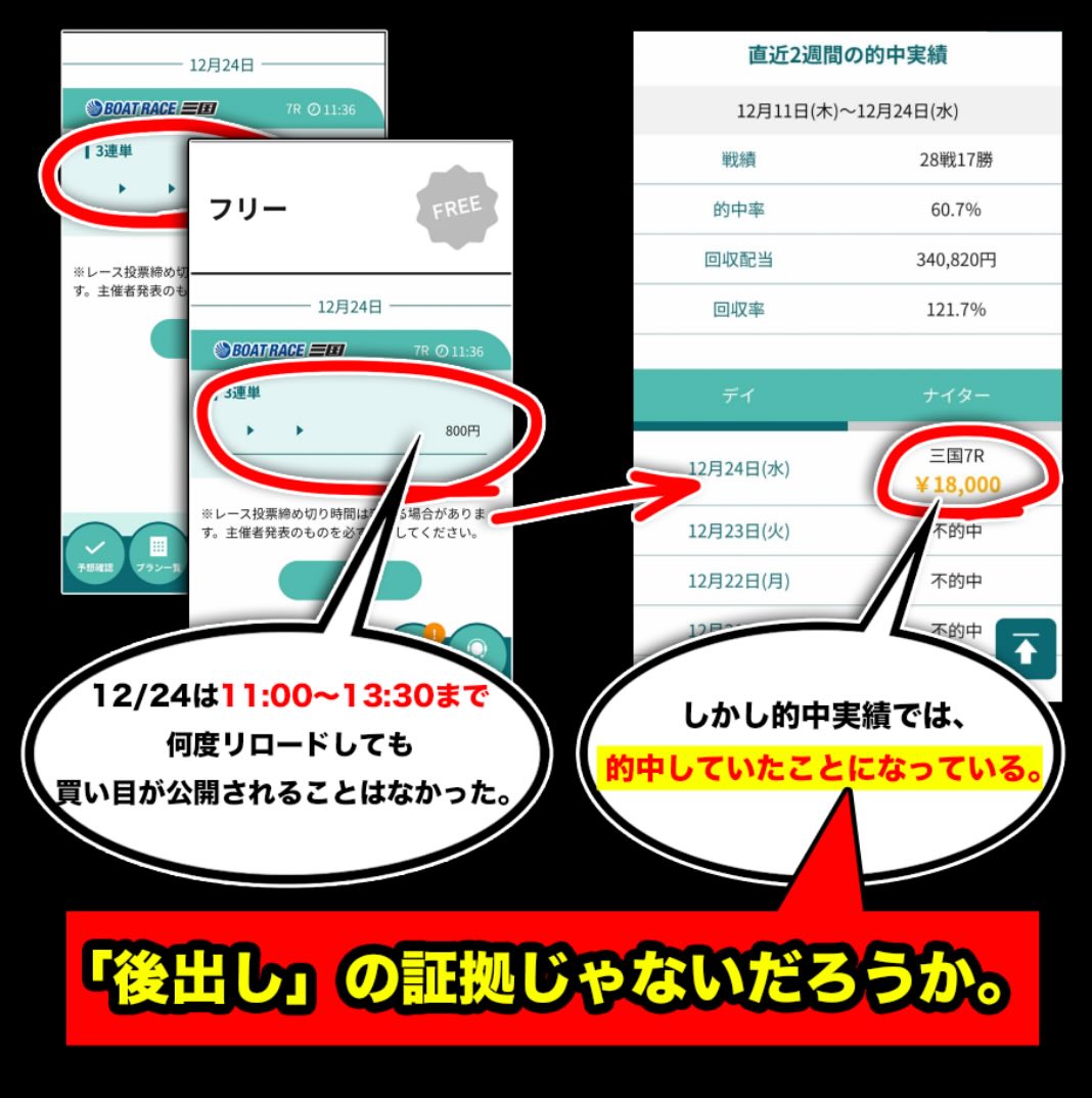 さらに、無料予想においても、利用者側で買い目を確認できない状況が続いた一方で、後日、「的中」と掲載され、さらにその翌日も完売表示のままで買い目が公開されることはなかった。このようなことが常習化していると、「意図的なんじゃないか」と受け取られても否定できない。