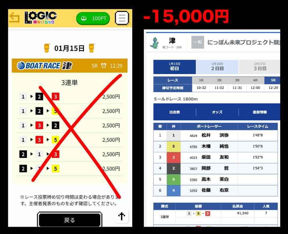 今回抜き打ちで検証する競艇予想サイト競艇ロジックの無料予想(無料情報)は、2026年1月15日の津5Rで提供された買い目である。