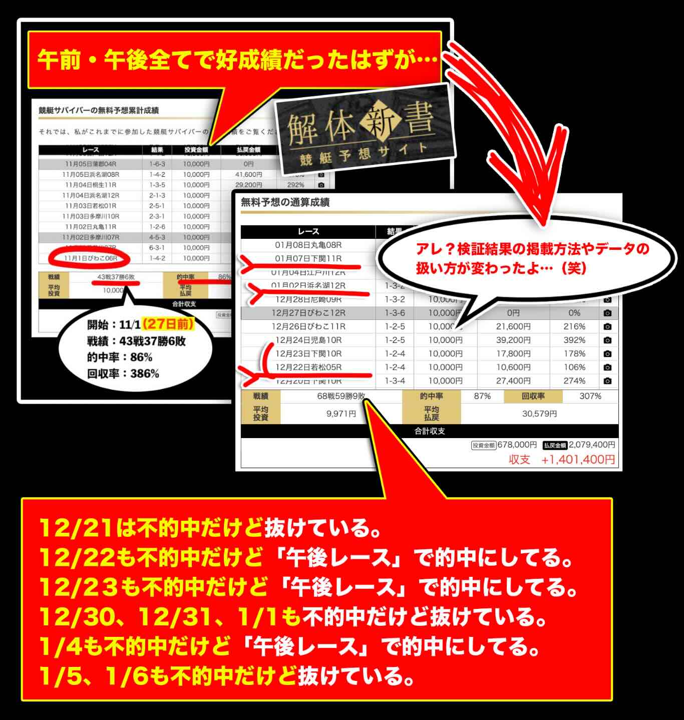 外部サイトの戦績を時系列で追うと、一定期間以降、午前レースが不的中だった日は午後レースのみを掲載し、不的中が続いた日は戦績自体が省かれているように見えるケースが確認された。