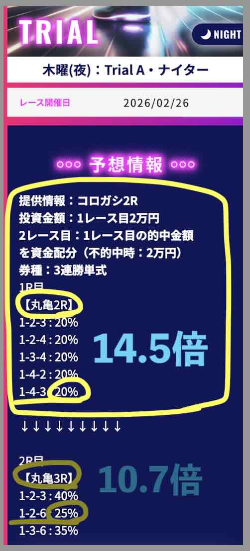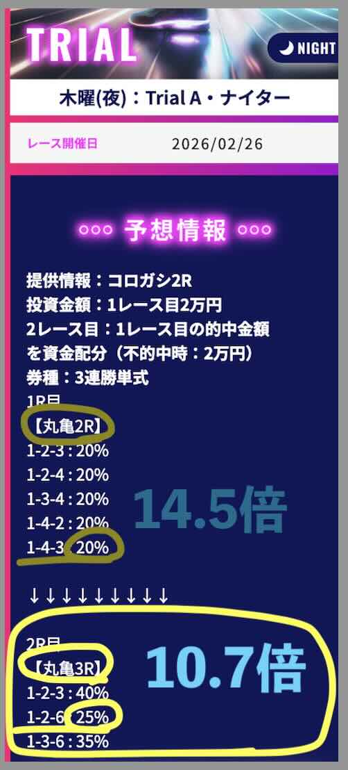 2/26には「TRIALナイター」という120ptの安価なコースで、丸亀2R(14.5倍)→丸亀3R(10.7倍)とコロガシが上手くいき、15万 5150円の払戻しとなった。